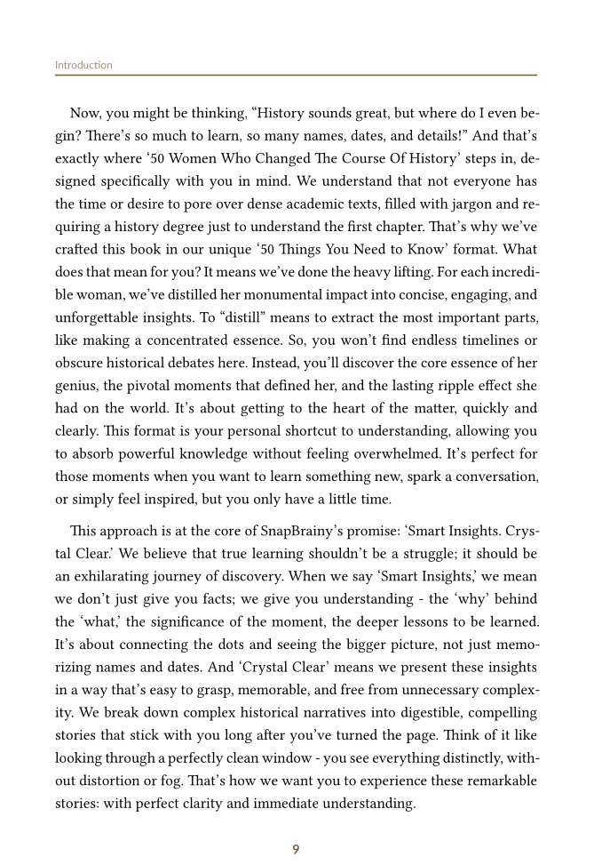 In "50 Women Who Changed The Course Of History," SnapBrainy invites you on an exhilarating intellectual adventure. This isn't a dry history lesson or a collection of mere biographical sketches. It's a masterclass in human nature, strategy, vision, and the enduring power of influence. Our "Smart Insights. Crystal Clear." format distills complex historical sagas into 50 distinct, digestible insights, empowering you to quickly grasp key concepts and apply them immediately.